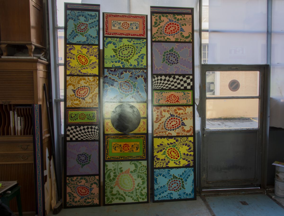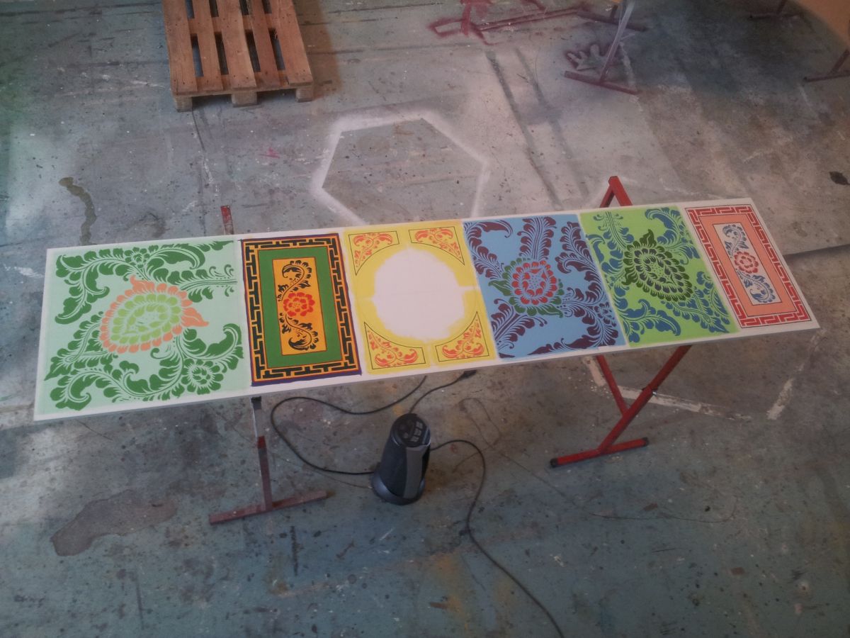 Soyons clairs, pas d'impression ici, ni de sérigraphie. D'abord les plateaux en mdf ont reçu plusieurs couches de fond d'accrochage. Puis vient l'application de deux couches de peinture pour la couleur de fond de chaque "bloc". Ensuite, les motifs ont été décalqués au papier carbone. Chaque élément est peint à la main à l'acrylique (deux couches à chaque fois). Et finalement, les bordures noires ont été peintes pour encadrer les motifs. Un travail de fourmi sur une dizaine de jours. Et une grande pensée solidaire pour certains ouvriers asiatiques qui doivent répéter, eux, des gestes artisanaux tout au long de l'année.
